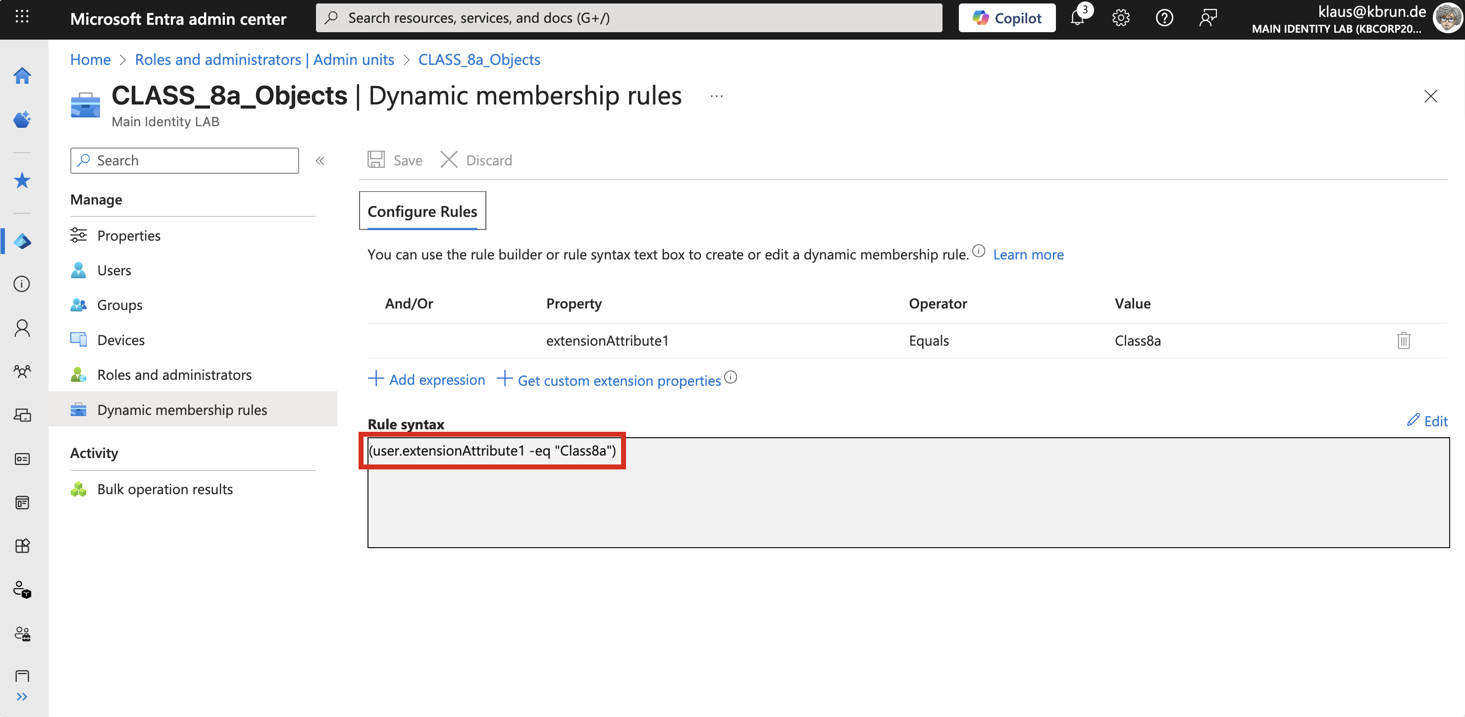 One of the most powerful aspects of Administrative Units is their support for dynamic membership rules. Objects can be placed into an AU automatically based on specific attributes. Common examples include attributes such as extensionAttributes or the department attribute or other. By using dynamic membership rules, user accounts can be automatically collected into the appropriate Administrative Units without manual intervention.