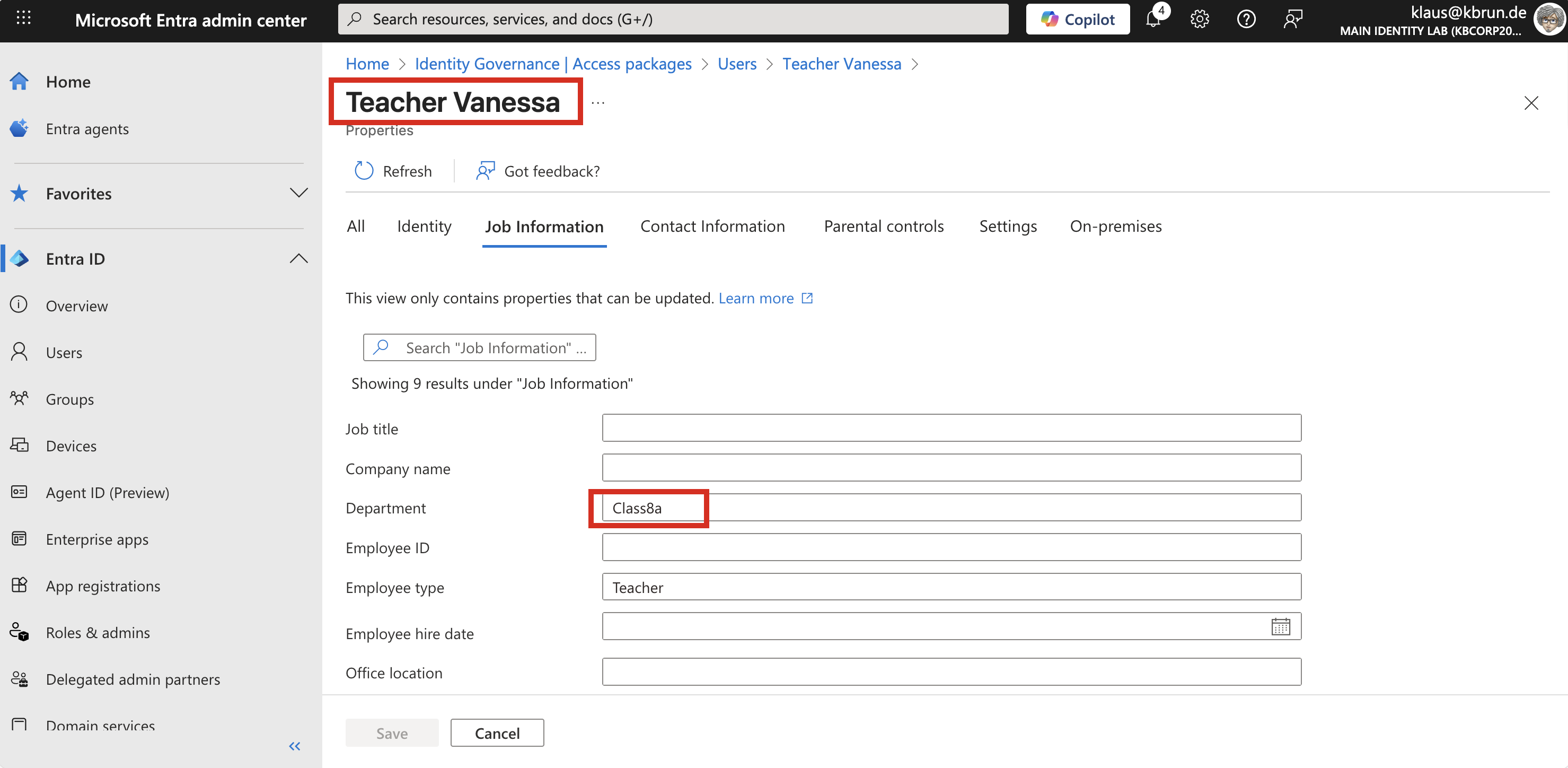 Wenn wir nun das Department-Attribut für ein Benutzerkonto ändern, dessen employeeType auf Teacher gesetzt ist, erhält der Benutzer automatisch das Access Package, das der im Department-Attribut des Benutzerobjekts angegebenen Schulklasse entspricht.