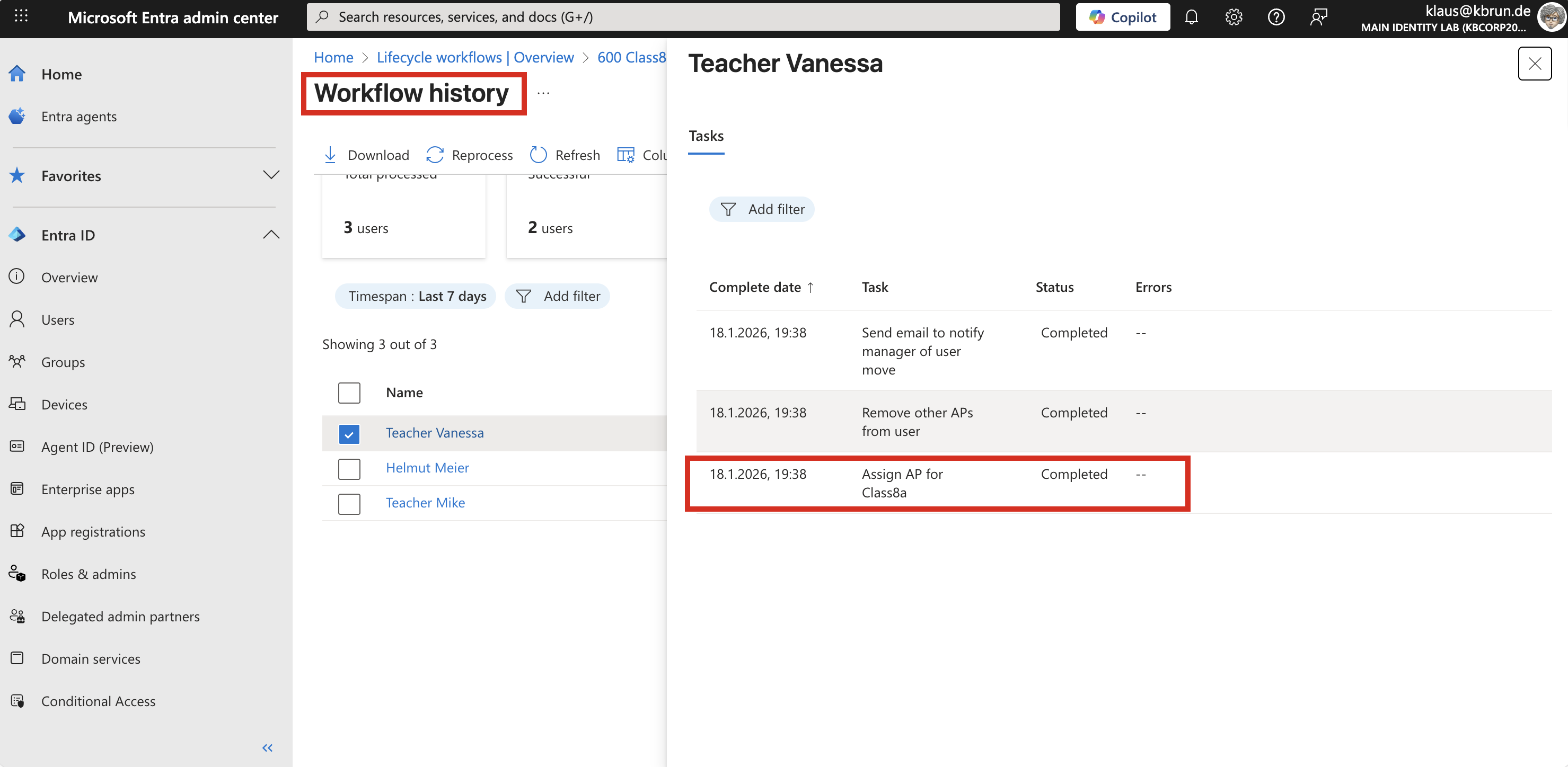 Special care must also be taken with the workflow task settings. For example, when removing existing Access Packages, the teacher’s user account might not actually have the Access Package assigned. Similarly, the user might not have a manager configured for email notifications, or the corresponding attribute might be missing. In such cases, the workflow would fail and stop execution.