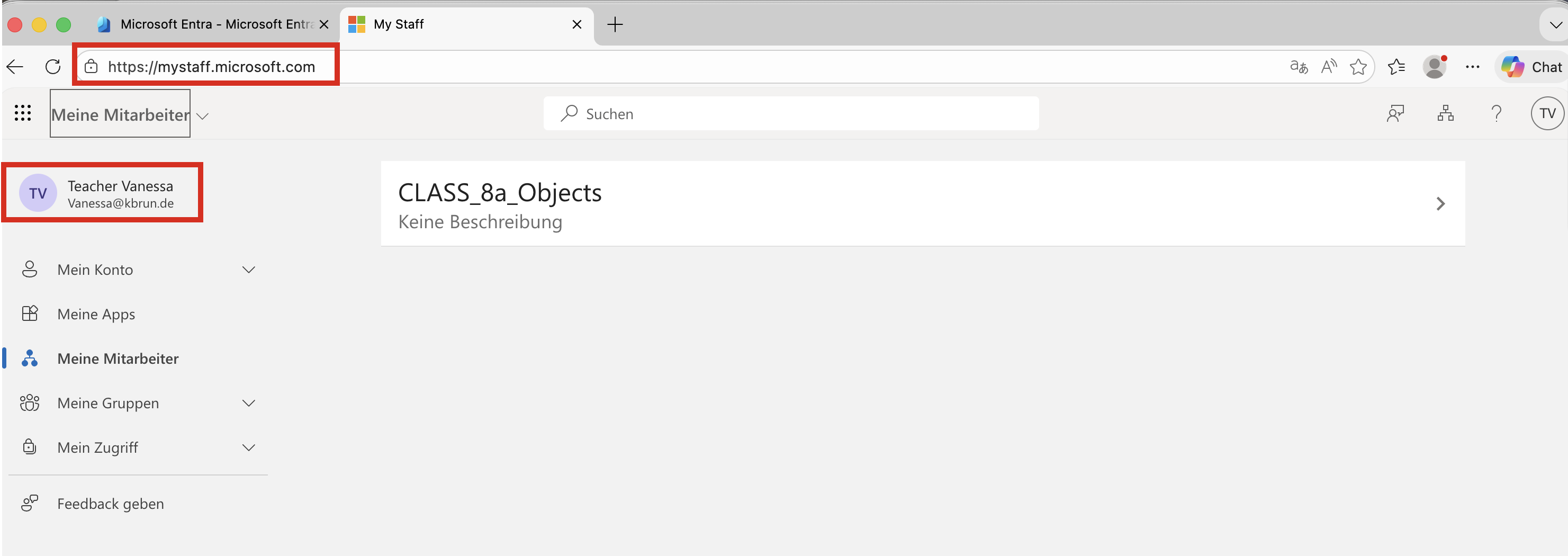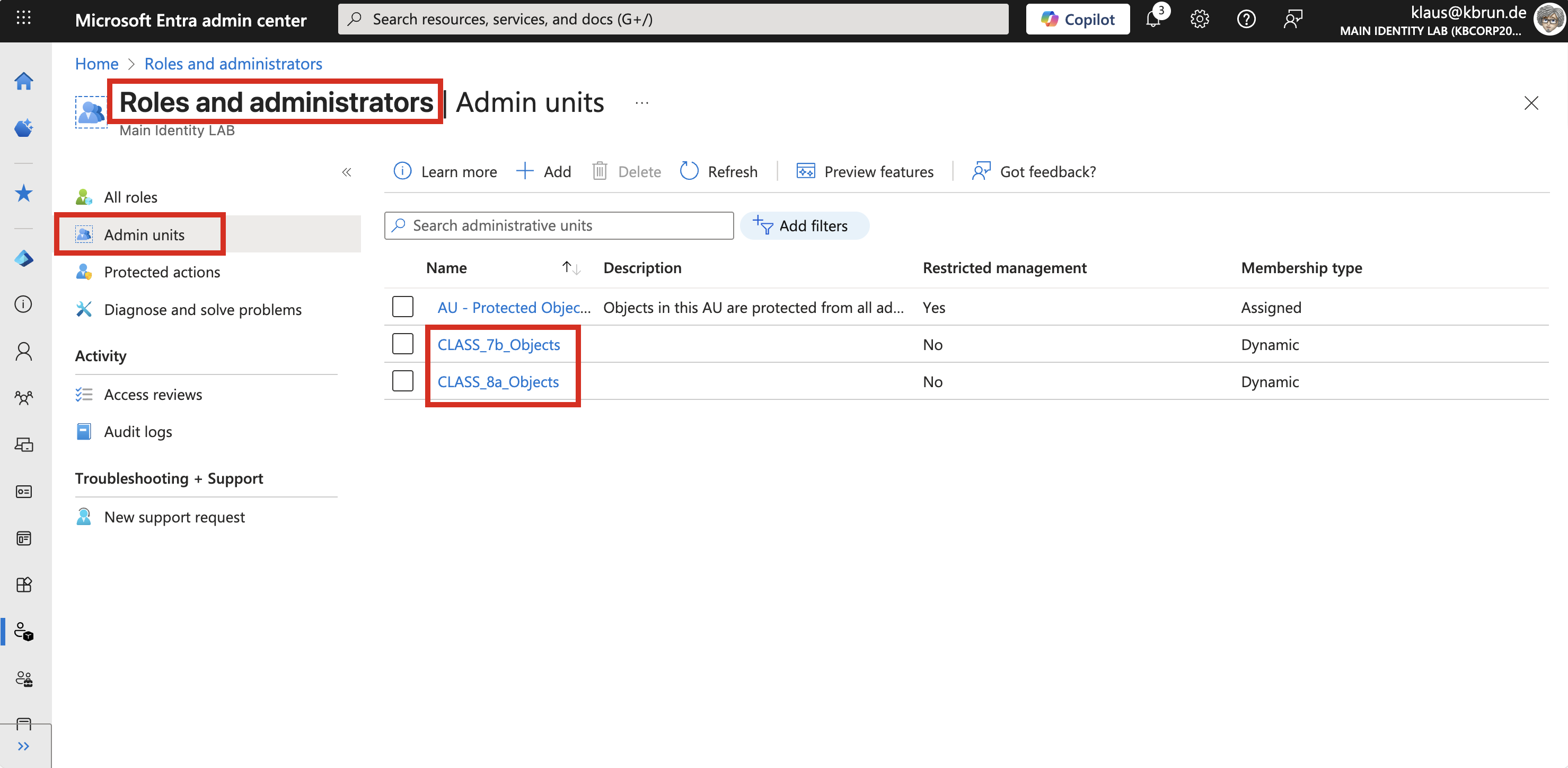 Mit dieser Konfiguration erhalten alle Benutzer, die eine Zuweisung in der Gruppe haben, die Rolle User Administrator, beschränkt auf die Administrative Unit der Klasse 8a.