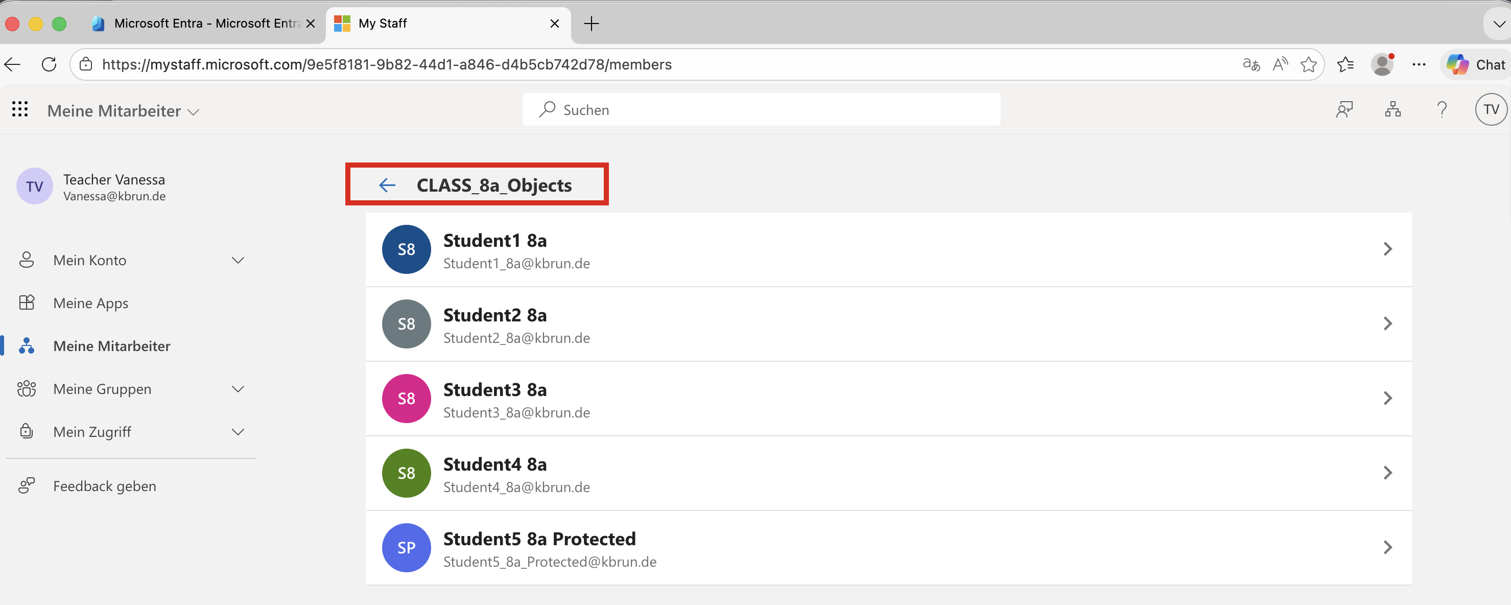 Basierend auf den Zuweisungen, die die jeweiligen PIM-Gruppen auf den Administrative Units haben, kann Vanessa nun die Schülerkonten in der Administrative Unit der Klasse 8a verwalten.
