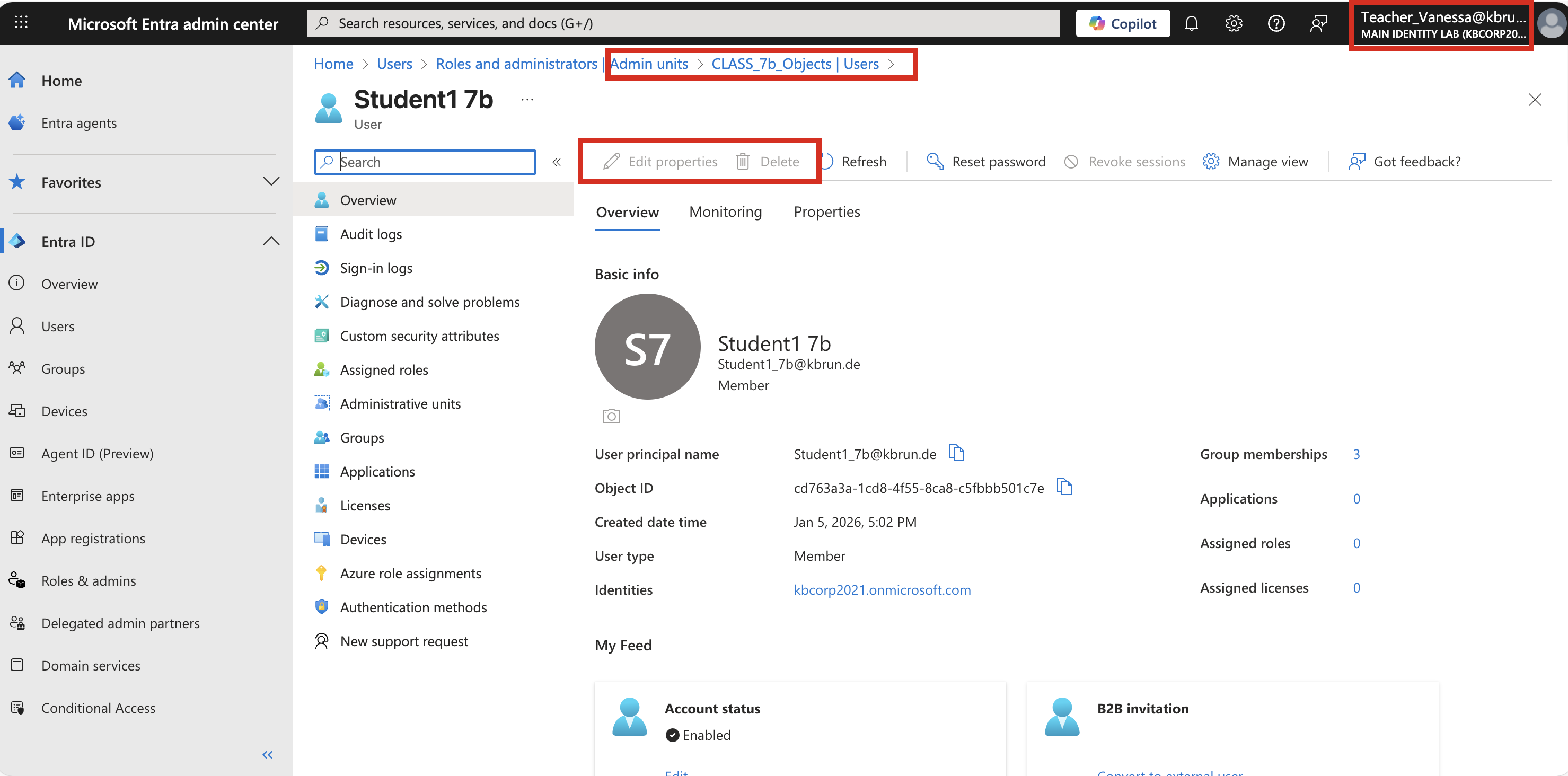 Nutzt sie stattdessen das Entra Admin Center, kann sie basierend auf ihrer administrativen Rolle alle Administrative Units sowie die darin enthaltenen Benutzer sehen. In der Administrative Unit der Klasse 7b sind die Optionen zum Bearbeiten der Benutzerkonten jedoch deaktiviert.