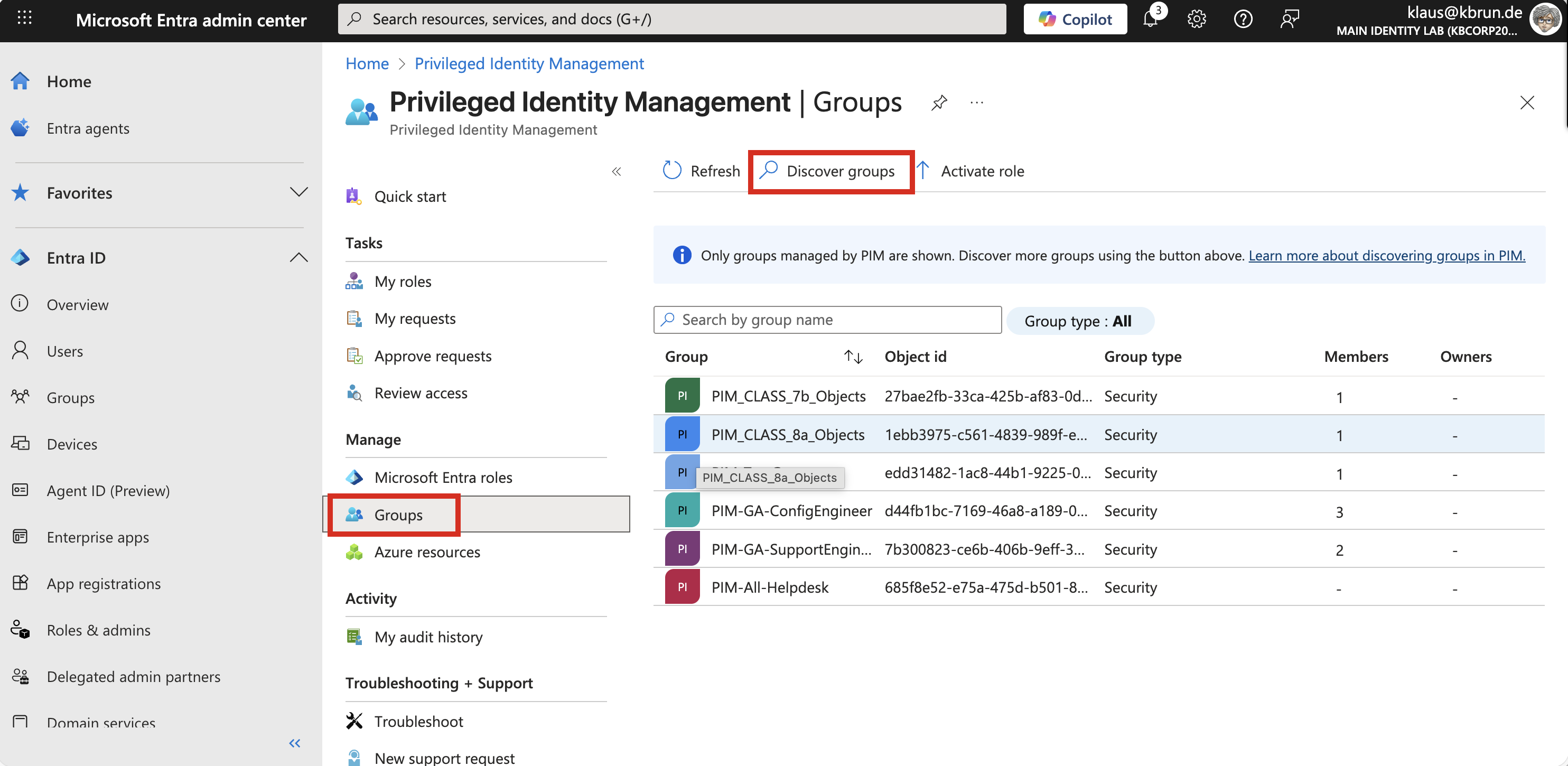 Dies erfolgt über die Option „Discover groups“, die alle Gruppen im Tenant auflistet, die mit der Option erstellt wurden, ihnen Rollen zuzuweisen, wie im vorherigen Schritt bei der Gruppenerstellung gezeigt.