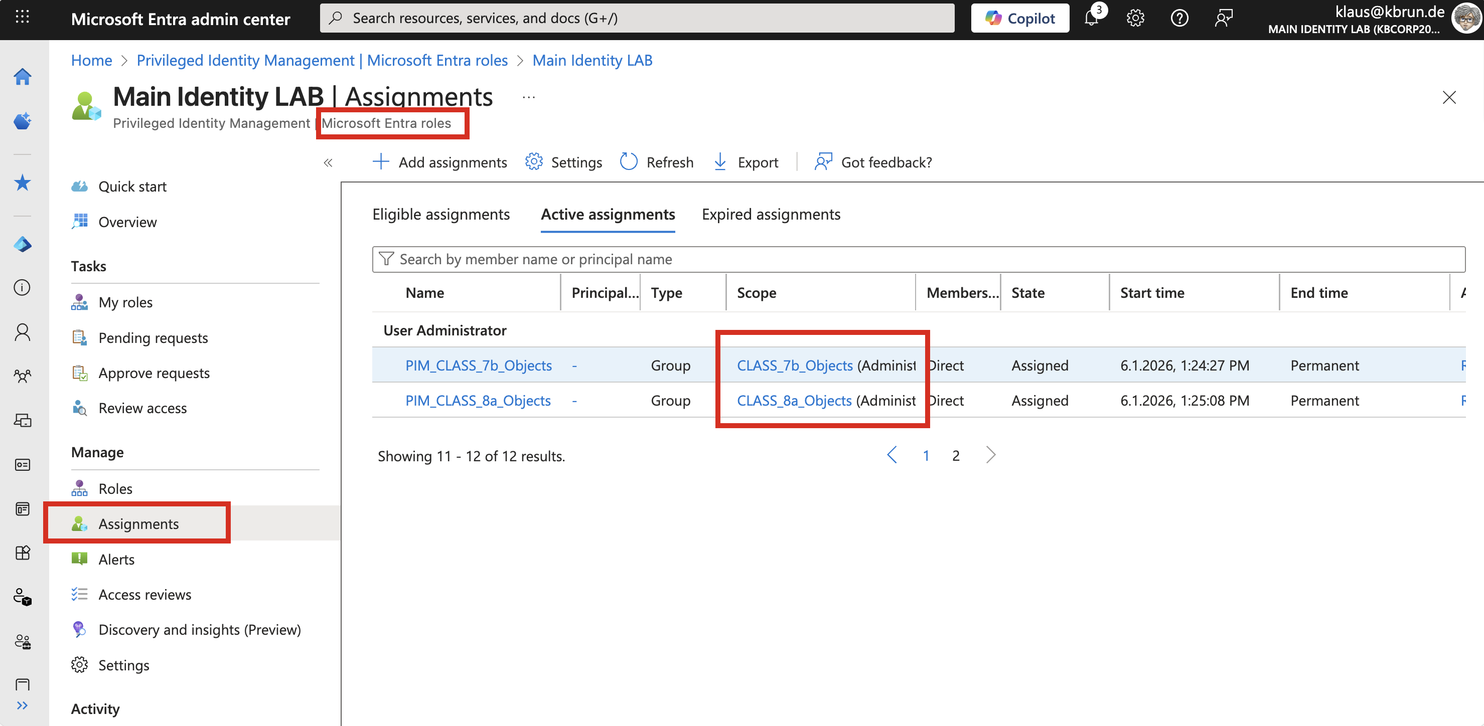To do this, we stay in the PIM dashboard and navigate to Roles, then to Assignments, where we assign the “User Administrator” role to the group as an active assignment. It is important not to select “Directory” as the scope, but instead choose the corresponding Administrative Unit for class 8a.