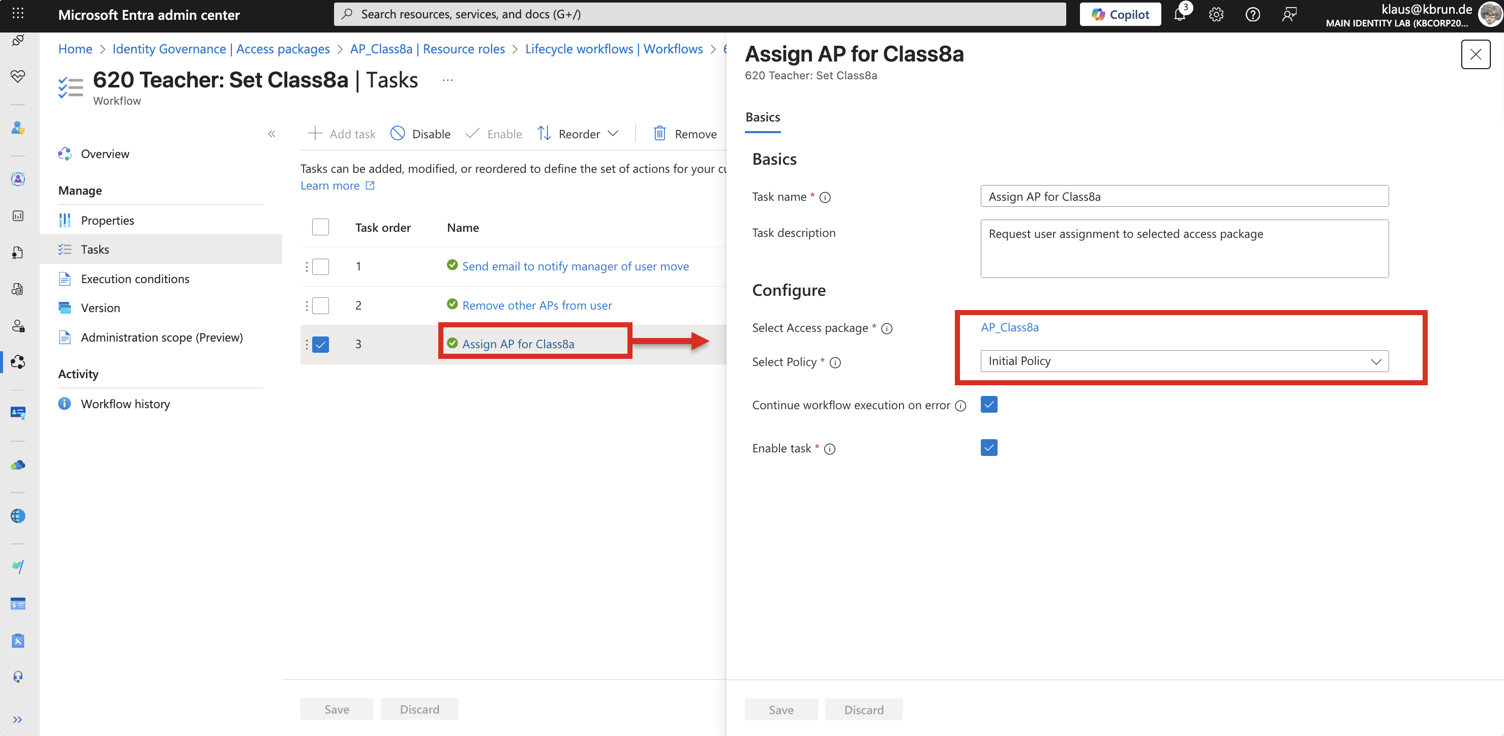 Abschließend wird das Access Package zugewiesen, für das dieser Workflow ausgelöst wurde. In unserem Beispiel ist dies das Access Package für die Klasse 8a.