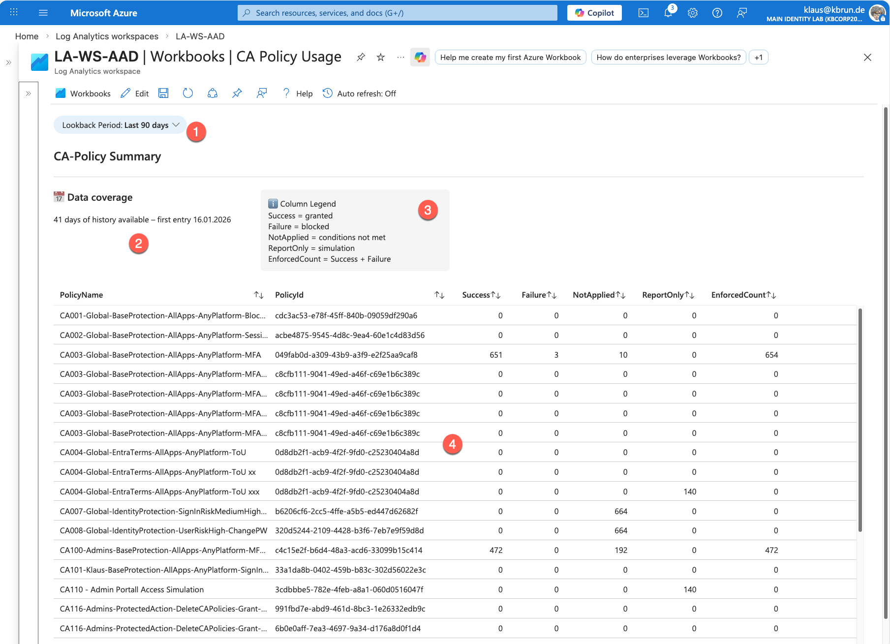 Dabei ist mir im Rahmen meiner Entra-Housekeeping-Aktivitäten aufgefallen, dass es kein zentrales Workbook gibt, das zeigt, welche Policy erfolgreich angewendet wurde, welche blockiert hat und welche möglicherweise nie greift und damit potenziell überflüssig ist.