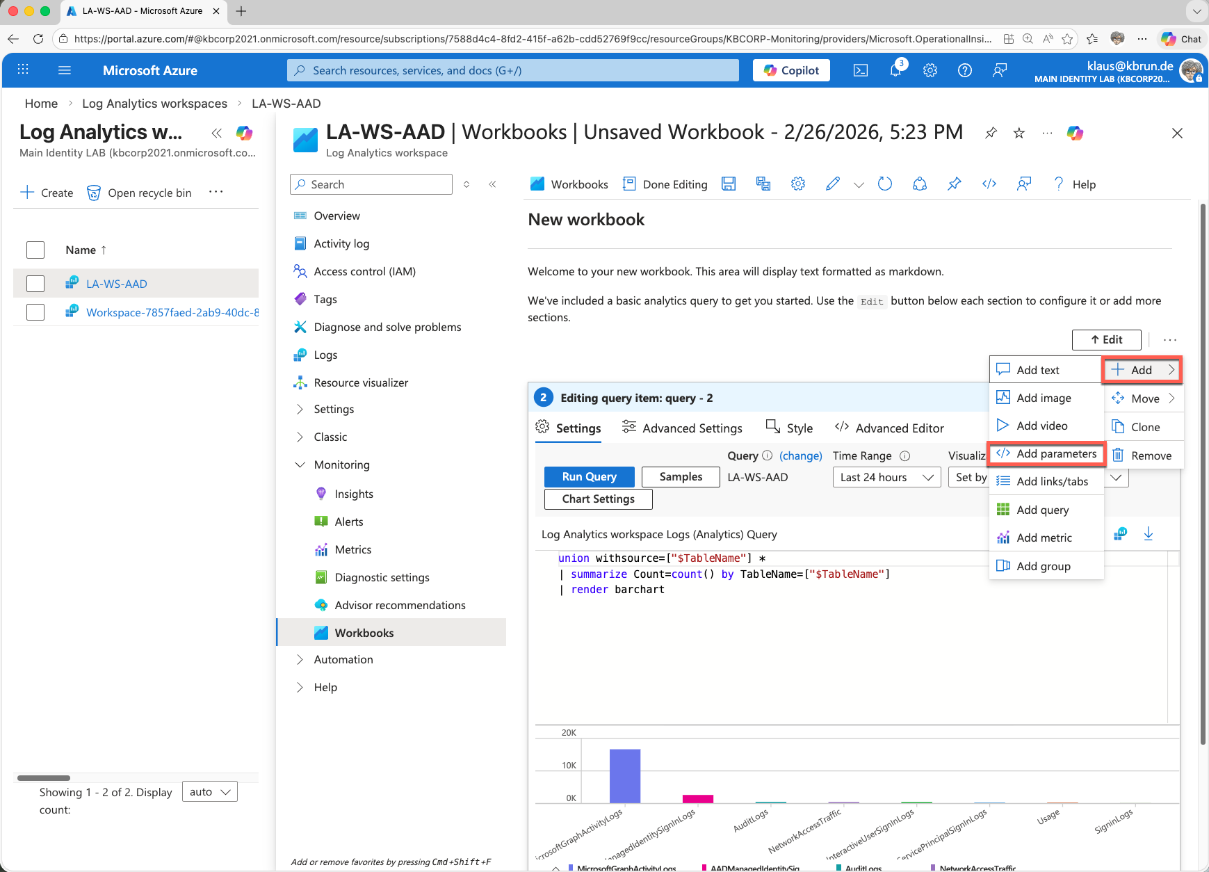 If you have created a new, empty workbook, the first step is to add a new element. In our case, we need a parameter that will later act as a variable within the actual KQL query.